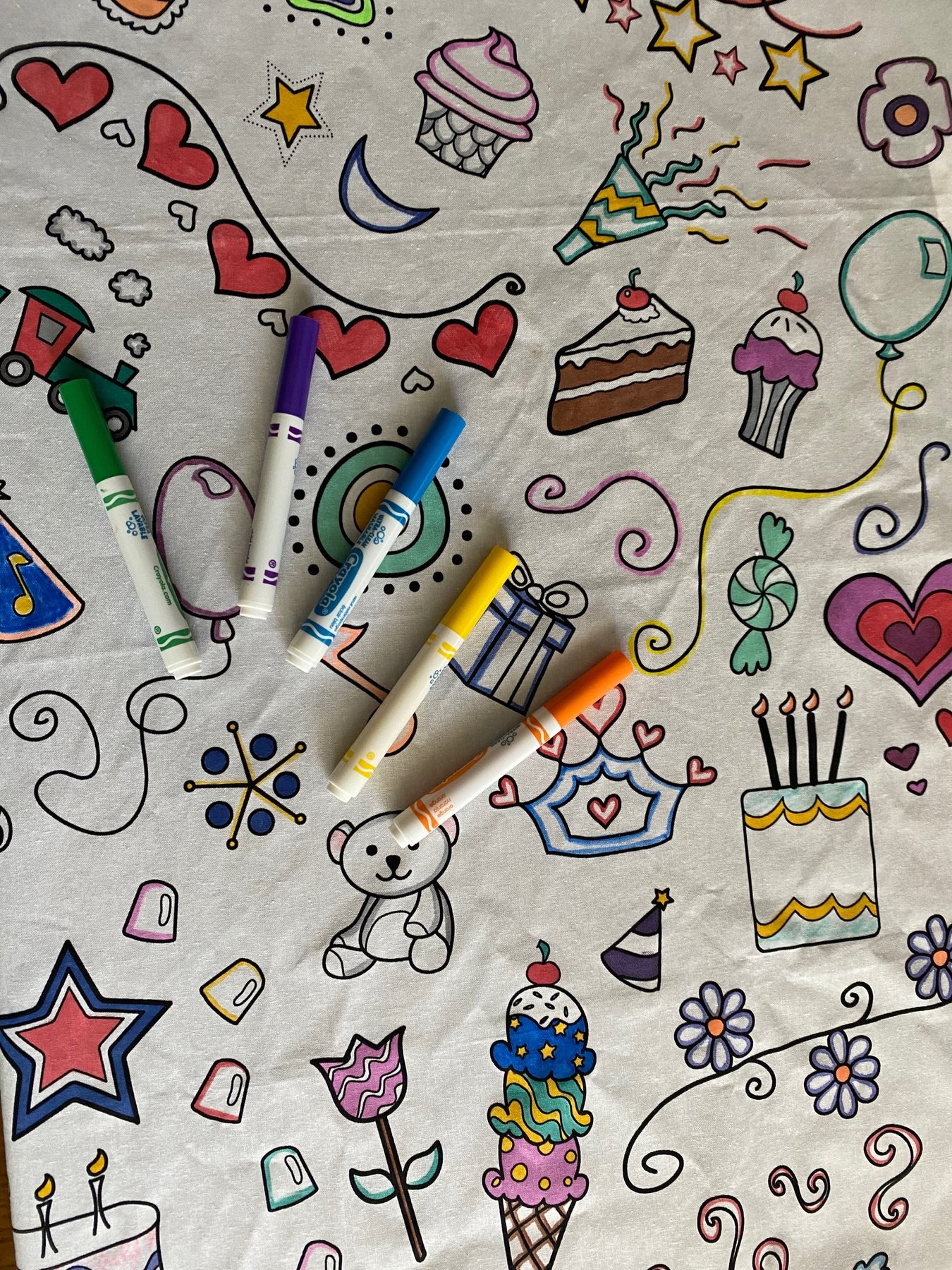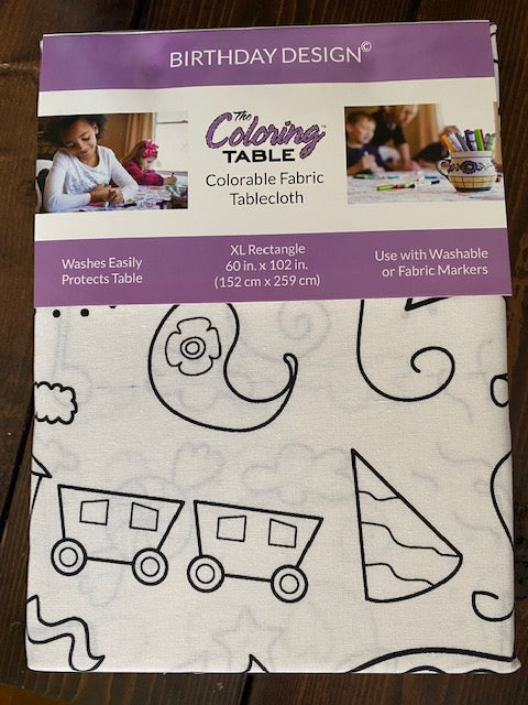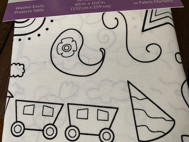 This fabric is a Poly-cotton blend with a specialty backing that assures markers will not bleed through when coloring. It is a reusable, machine washable and wrinkle free fabric.